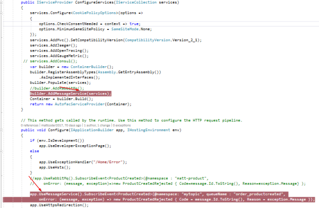 {public class AzureBusSubscriber : BaseSubscriber, IBusSubscriber {private readonly string azureConnection;private readonly IServiceProvider provider;public AzureBusSubscriber(IServiceProvider provider):base(provider){azureConnection = provider.GetService<AzureBusOptions>().connection;this.provider = provider;_logger = provider.GetService<ILogger<AzureBusSubscriber>>();}public IBusSubscriber SubscribeCommand<TCommand>(string @namespace = null, string queueName = null, Func<TCommand, Exception, IRejectedEvent> onError = null) where TCommand : ICommand{throw new NotImplementedException();}public async Task<IBusSubscriber> SubscribeEvent<TEvent>(string @namespace = null, string queueName = null, Func<TEvent, Exception, IRejectedEvent> onError = null) where TEvent : IEvent{var client = new ManagementClient(azureConnection);if (!await client.SubscriptionExistsAsync(@namespace, queueName, CancellationToken.None)){await client.CreateSubscriptionAsync(@namespace, queueName, CancellationToken.None);}SubscriptionClient subscriptionClient = new SubscriptionClient(azureConnection, @namespace, queueName, ReceiveMode.ReceiveAndDelete, RetryPolicy.Default);var options = new MessageHandlerOptions(e =>{return Task.CompletedTask;}){AutoComplete = false,MaxAutoRenewDuration = TimeSpan.FromMinutes(1)};subscriptionClient.RegisterMessageHandler(async (message, token) => {TEvent @event = default(TEvent);try{// Get messagevar data = Encoding.UTF8.GetString(message.Body);var propertydata = message.UserProperties["context"] as string;@event = JsonConvert.DeserializeObject<TEvent>(data);CorrelationContext correlationContext = JsonConvert.DeserializeObject<CorrelationContext>(propertydata);var eventHandler = provider.GetService<IEventHandler<TEvent>>();//return await TryHandleAsync(@event, correlationContext,await BaseTryHandleAsync(@event, correlationContext,() => eventHandler.HandleAsync(@event, correlationContext), onError);}catch (Exception ex){//await client.DeadLetterAsync(message.SystemProperties.LockToken);