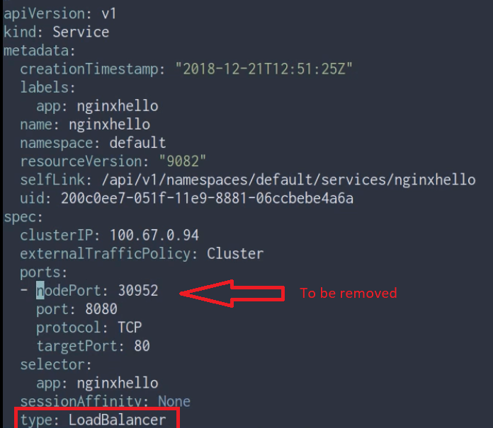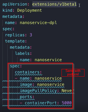 spec:containers:- name: nanoserviceimage: nanoservice5000           imagePullPolicy: Neverports:- containerPort: 5000