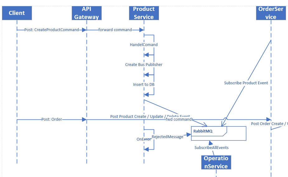 Scenario 1 ProductService received rest post message to persist a product and publish the product persistence message as event to rabbitmq