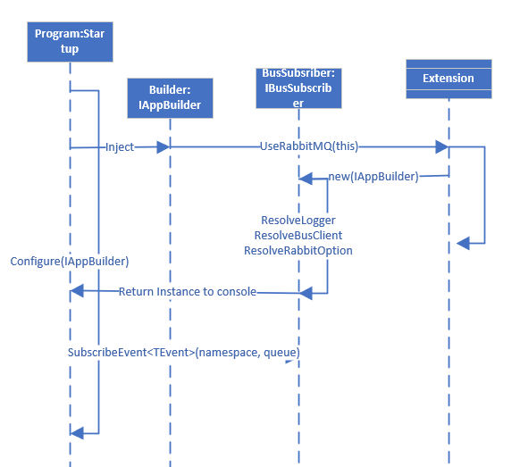 {public class BusSubscriber : IBusSubscriber{private readonly ILogger _logger;private readonly IBusClient _busClient;private readonly IServiceProvider _serviceProvider;private readonly string _defaultNamespace;private readonly int _retries;private readonly int _retryInterval;public BusSubscriber(IApplicationBuilder app){_logger = app.ApplicationServices.GetService<ILogger<BusSubscriber>>();_serviceProvider = app.ApplicationServices.GetService<IServiceProvider>();_busClient = _serviceProvider.GetService<IBusClient>();var options = _serviceProvider.GetService<RabbitMqOptions>();_defaultNamespace = options.Namespace;_retries = options.Retries >= 0 ? options.Retries : 3;_retryInterval = options.RetryInterval > 0 ? options.RetryInterval : 2;}public IBusSubscriber SubscribeCommand<TCommand>(string @namespace = null, string queueName = null,Func<TCommand, Exception, IRejectedEvent> onError = null)where TCommand : ICommand{_busClient.SubscribeAsync<TCommand, CorrelationContext>(async (command, correlationContext) =>{var commandHandler = _serviceProvider.GetService<ICommandHandler<TCommand>>();return await TryHandleAsync(command, correlationContext,() => commandHandler.HandleAsync(command, correlationContext), onError);},ctx => ctx.UseSubscribeConfiguration(cfg =>cfg.FromDeclaredQueue(q => q.WithName(GetQueueName<TCommand>(@namespace, queueName)))));return this;}public IBusSubscriber SubscribeEvent<TEvent>(string @namespace = null, string queueName = null,Func<TEvent, Exception, IRejectedEvent> onError = null)where TEvent : IEvent{_busClient.SubscribeAsync<TEvent, CorrelationContext>(async (@event, correlationContext) =>{var eventHandler = _serviceProvider.GetService<IEventHandler<TEvent>>();return await TryHandleAsync(@event, correlationContext,() => eventHandler.HandleAsync(@event, correlationContext), onError);},ctx => ctx.UseSubscribeConfiguration(cfg =>cfg.FromDeclaredQueue(q => q.WithName(GetQueueName<TEvent>(@namespace, queueName)))));return this;}// Internal retry for services that subscribe to the multiple events of the same types.// It does not interfere with the routing keys and wildcards (see TryHandleWithRequeuingAsync() below).private async Task<Acknowledgement> TryHandleAsync<TMessage>(TMessage message,CorrelationContext correlationContext,Func<Task> handle, Func<TMessage, Exception, IRejectedEvent> onError = null){var currentRetry = 0;var retryPolicy = Policy.Handle<Exception>().WaitAndRetryAsync(_retries, i => TimeSpan.FromSeconds(_retryInterval));var messageName = message.GetType().Name;return await retryPolicy.ExecuteAsync<Acknowledgement>(async ()=>{try{var retryMessage = currentRetry == 0? string.Empty: $"Retry: {currentRetry}'.";_logger.LogInformation($"Handling a message: '{messageName}' " +$"with correlation id: '{correlationContext.Id}'. {retryMessage}");await handle();_logger.LogInformation($"Handled a message: '{messageName}' " +$"with correlation id: '{correlationContext.Id}'. {retryMessage}");return new Ack();}//catch (CustomizedException<IEventHandler<IEvent>> exception)//{//    System.Diagnostics.Debug.WriteLine(exception.Message);//    return new Ack();//}catch (Exception exception){currentRetry++;_logger.LogError(exception, exception.Message);if (exception.GetType().FullName.Contains("CustomizedException") && onError != null){var rejectedEvent = onError(message, exception);await _busClient.PublishAsync(rejectedEvent, ctx => ctx.UseMessageContext(correlationContext));_logger.LogInformation($"Published a rejected event: '{rejectedEvent.GetType().Name}' " +$"for the message: '{messageName}' with correlation id: '{correlationContext.Id}'.");return new Ack();}throw new Exception($"Unable to handle a message: '{messageName}' " +$"with correlation id: '{correlationContext.Id}', " +$"retry {currentRetry - 1}/{_retries}...");}});}// RabbitMQ retry that will publish a message to the retry queue.// Keep in mind that it might get processed by the other services using the same routing key and wildcards.private async Task<Acknowledgement> TryHandleWithRequeuingAsync<TMessage>(TMessage message,CorrelationContext correlationContext,Func<Task> handle, Func<TMessage, Exception, IRejectedEvent> onError = null){var messageName = message.GetType().Name;var retryMessage = correlationContext.Retries == 0? string.Empty: $"Retry: {correlationContext.Retries}'.";_logger.LogInformation($"Handling a message: '{messageName}' " +$"with correlation id: '{correlationContext.Id}'. {retryMessage}");try{await handle();_logger.LogInformation($"Handled a message: '{messageName}' " +$"with correlation id: '{correlationContext.Id}'. {retryMessage}");return new Ack();}catch (Exception exception){_logger.LogError(exception, exception.Message);if (exception is Exception dShopException && onError != null){var rejectedEvent = onError(message, dShopException);await _busClient.PublishAsync(rejectedEvent, ctx => ctx.UseMessageContext(correlationContext));_logger.LogInformation($"Published a rejected event: '{rejectedEvent.GetType().Name}' " +$"for the message: '{messageName}' with correlation id: '{correlationContext.Id}'.");return new Ack();}if (correlationContext.Retries >= _retries){await _busClient.PublishAsync(RejectedEvent.For(messageName),ctx => ctx.UseMessageContext(correlationContext));throw new Exception($"Unable to handle a message: '{messageName}' " +$"with correlation id: '{correlationContext.Id}' " +$"after {correlationContext.Retries} retries.", exception);}_logger.LogInformation($"Unable to handle a message: '{messageName}' " +$"with correlation id: '{correlationContext.Id}', " +$"retry {correlationContext.Retries}/{_retries}...");return Retry.In(TimeSpan.FromSeconds(_retryInterval));}}private string GetQueueName<T>(string @namespace = null, string name = null){@namespace = string.IsNullOrWhiteSpace(@namespace)? (string.IsNullOrWhiteSpace(_defaultNamespace) ? string.Empty : _defaultNamespace): @namespace;var separatedNamespace = string.IsNullOrWhiteSpace(@namespace) ? string.Empty : $"{@namespa