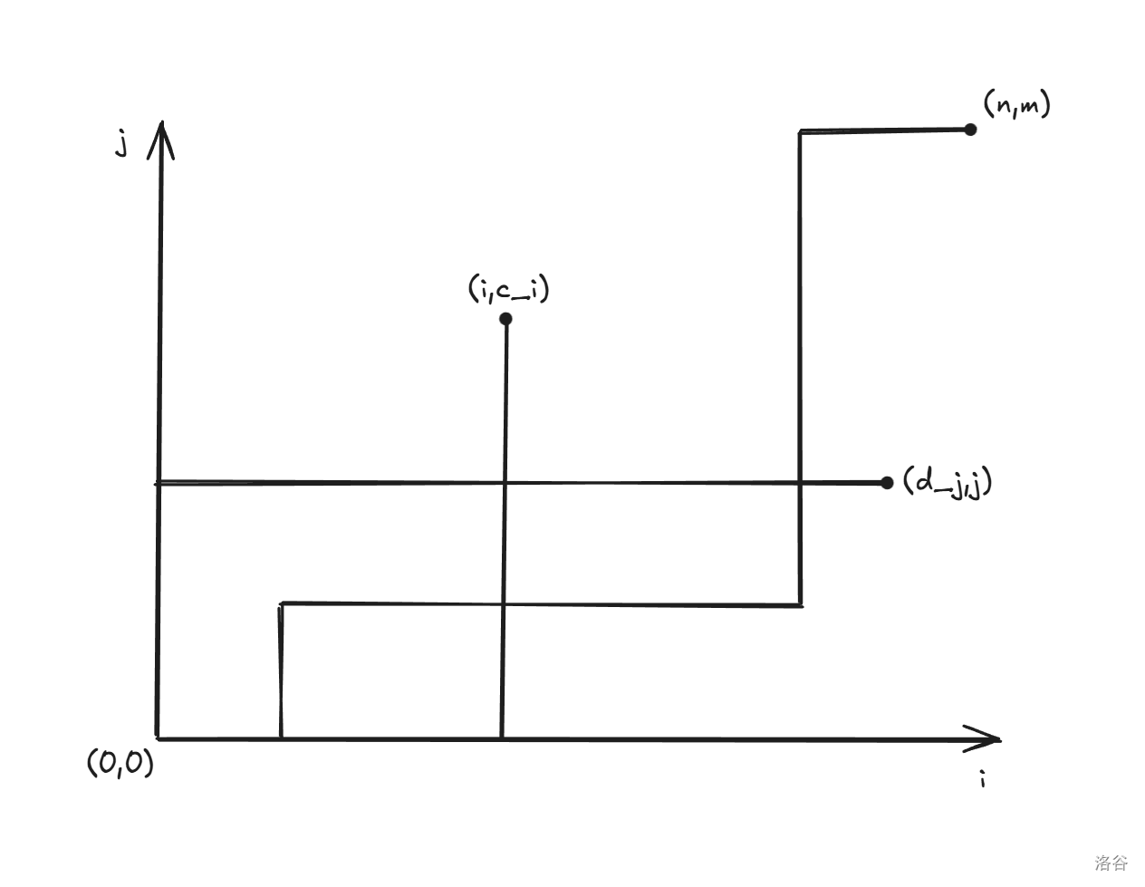 预处理 \(c_i\) 表示最大的 \(j\) 使得 \(b_j\leq s_i-a_i\)\(d_j\) 表示最大的 \(i\) 使得 \(a_i\leq t_j-b_j\)。自然地放到平面上考虑,将所有 \((i,c_i)\)\((d_j,j)\) 标为关键点。考虑一条从 \((0,0)\)\((n,m)\) 的路径,发现问题可以转化成:若点 \((i,c_i)\) 在路径的上方(非严格)则可以获得 \(p_i\) 分,若点 \((d_j,j)\) 在路径的下方(非严格)则可以获得 \(q_j\) 分,最大化得分。如下图所示。