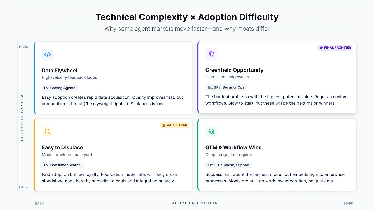 无论AI代理处于哪个市场象限,数据都是唯一的护城河——要么通过"易采用"快速积累训练数据, 要么通过"难采用"锁定客户专属知识。