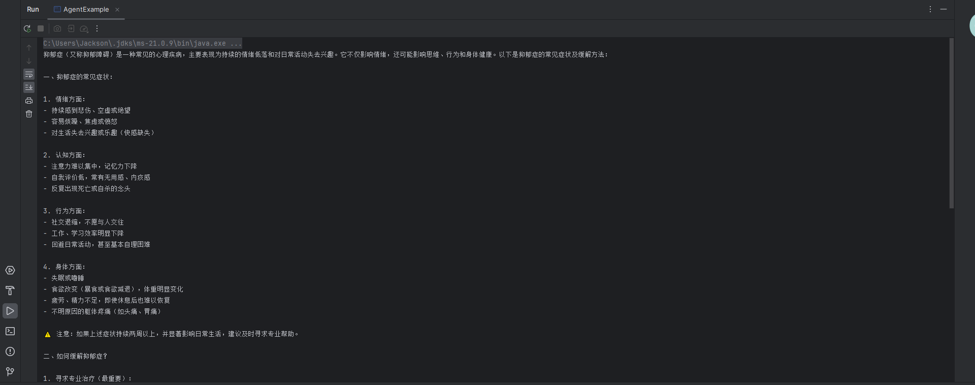public class AgentExample {public static void main(String[] args) throws Exception {// 1. 创建模型实例(记得替换成你自己的API Key)DashScopeApi dashScopeApi = DashScopeApi.builder().apiKey("sk-309xxxxxxxxxxxxxxxxxxxxxxxx").build();ChatModel chatModel = DashScopeChatModel.builder().dashScopeApi(dashScopeApi).build();// 2. 创建智能体角色ReactAgent agent = ReactAgent.builder().name("智能心理咨询师").model(chatModel).instruction("你是一名10年经验的资深心理咨询师.").build();// 3. 与智能体对话var response = agent.call("抑郁症有些什么症状?该如何缓解?");System.out.println(response.getText());}