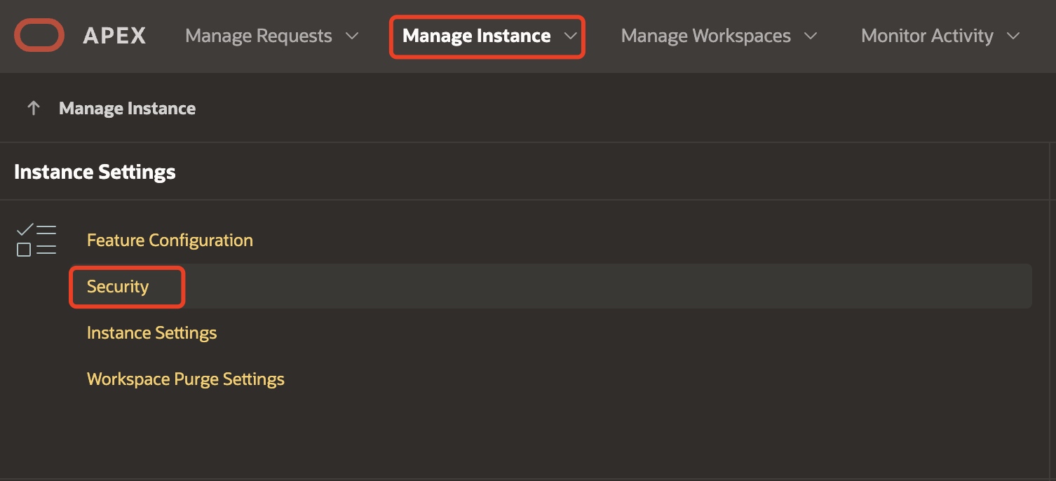 登录到 internal 的 workspace,设置路径: Manage Instance -> Security:
