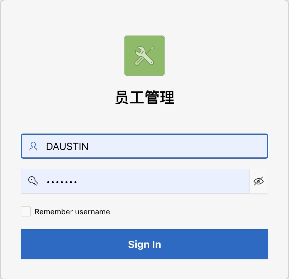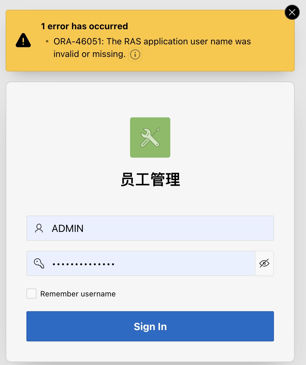 比如我们登录APEX的 员工管理 应用,会发现之前默认的 ADMIN 账号已经无法登录: