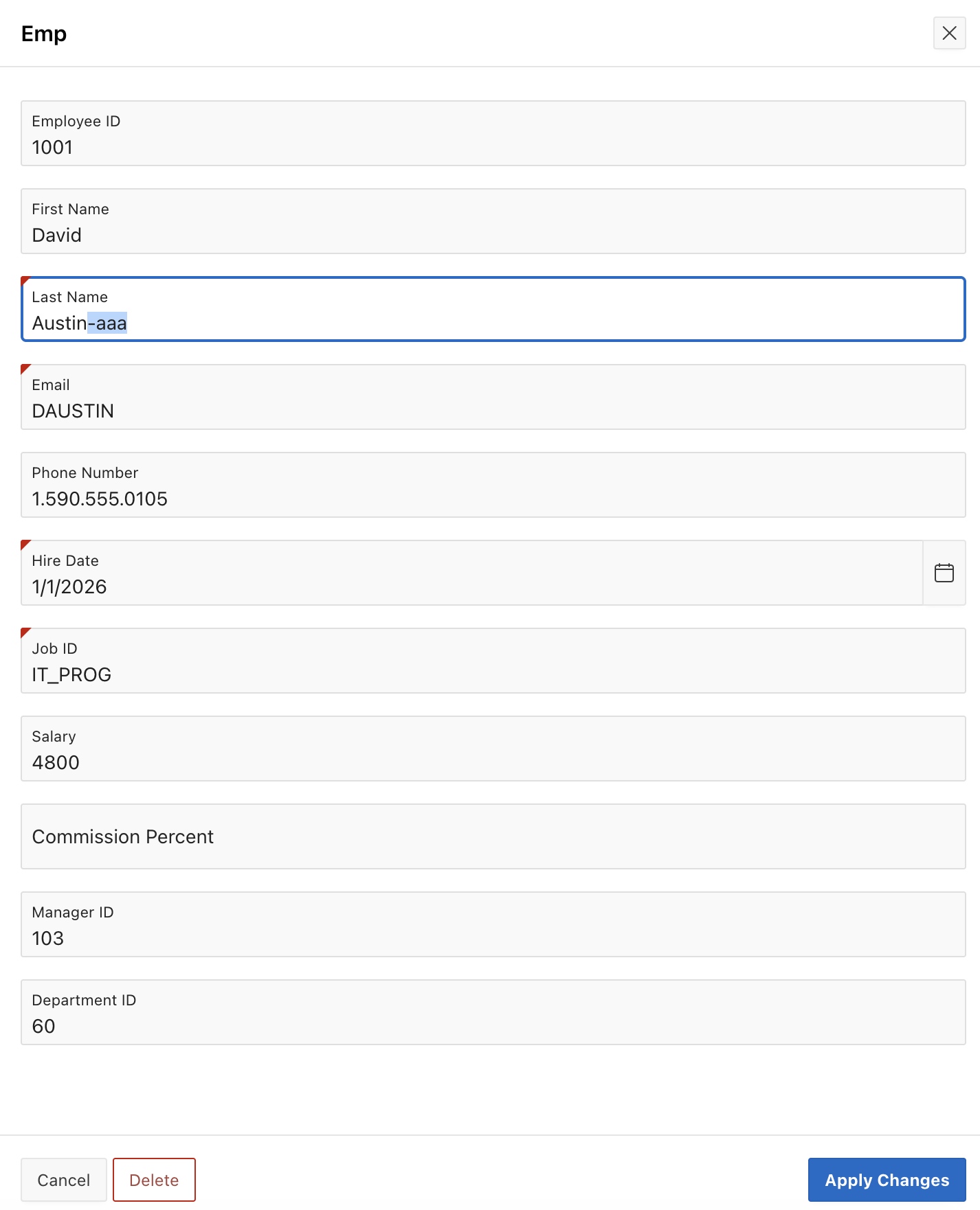 比如尝试在表单中修改Last Name的信息,然后 Apply Changes: