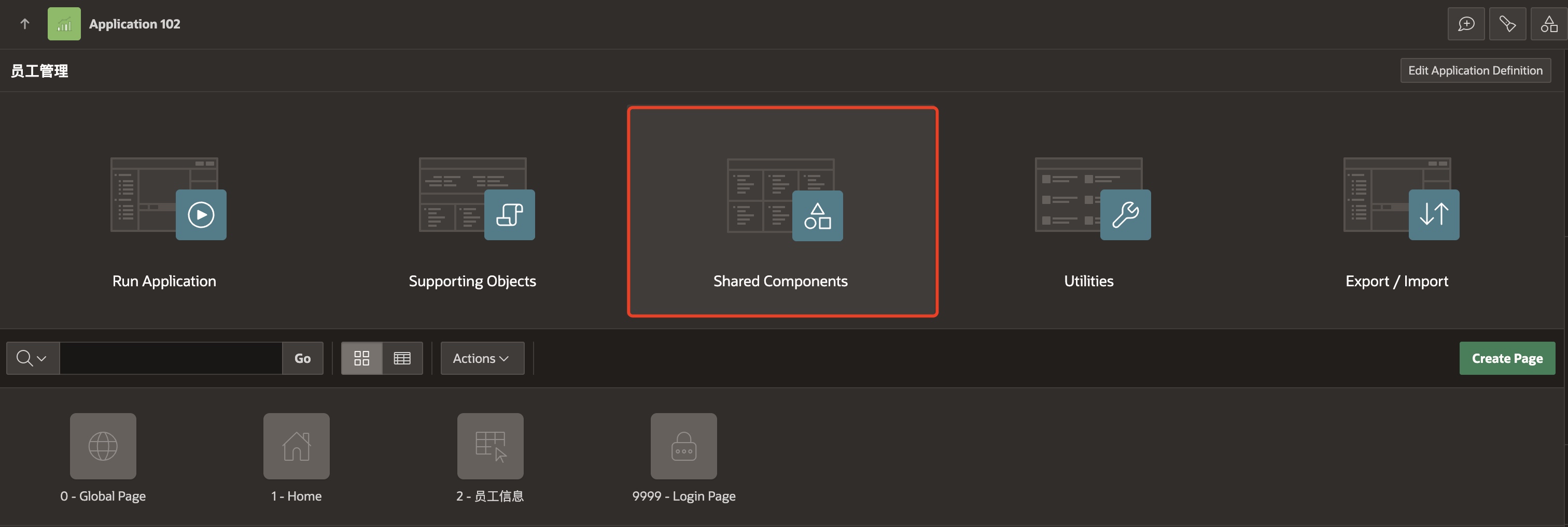需要找到具体的apex应用:员工管理,进入 Shared Components: