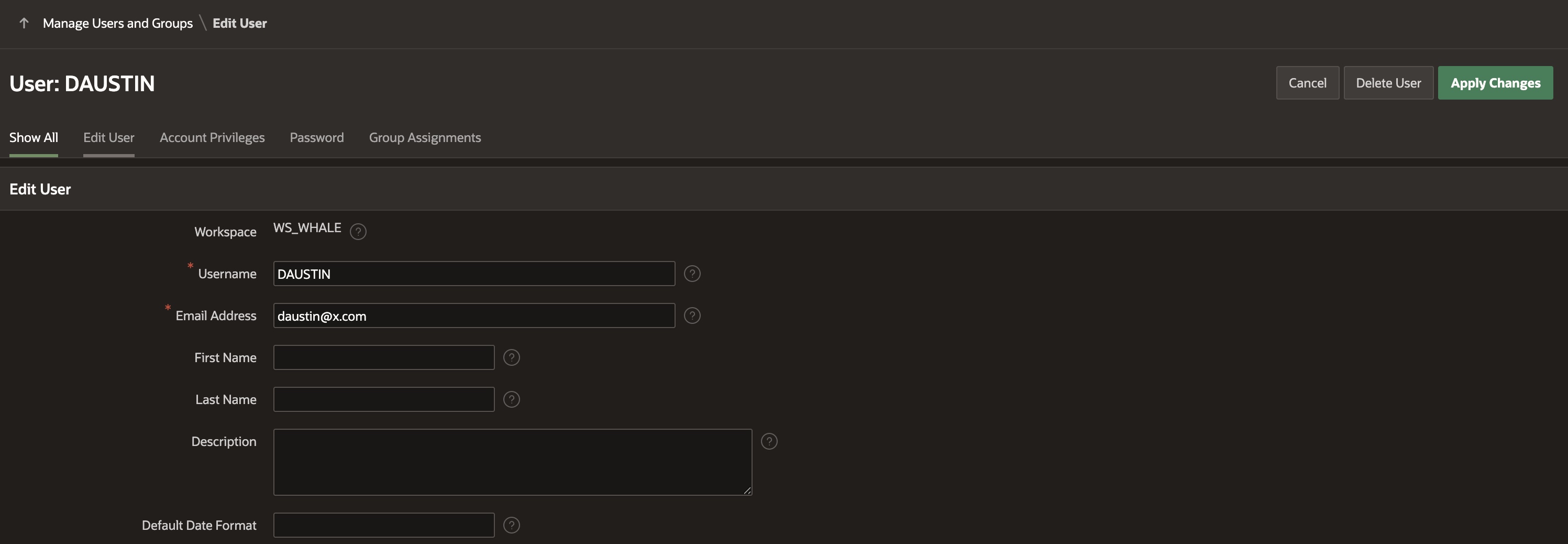 这里的用户需要和之前创建的应用用户相同,比如下面的 DAUSTIN 用户,测试阶段可以随便填一个邮箱: