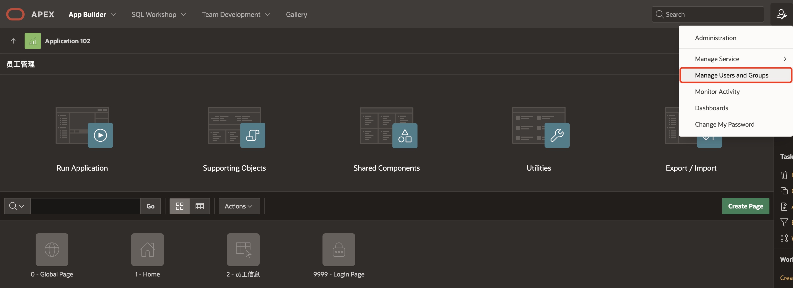 上面只是开启了RAS,因为我们选择的是 Internal Users,现在还需要同步在APEX配置用户,具体在下图所示的 Manage Users and Groups