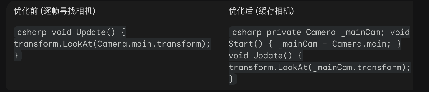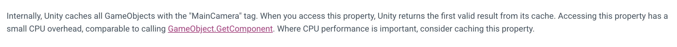 在 Unity 中,Camera.main 实际上是调用了 GameObject.FindWithTag("MainCamera"),这是一个非常耗时的操作