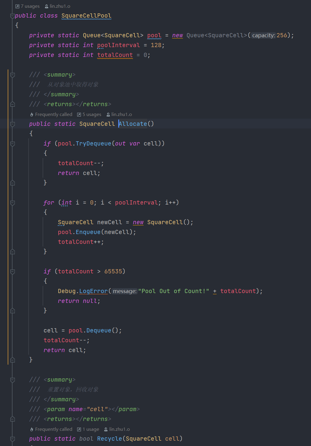 for (int i = 0; i < len - 1; i++) { ... SquareCell cell = new SquareCell(); ... } // 加入对象池 public class SquareCellPool { public static SquareCell Allocate() { if (pool.TryDequeue(out var cell)) { totalCount--; return cell; } for (int i = 0; i < poolInterval; i++) { SquareCell newCell = new SquareCell(); pool.Enqueue(newCell); totalCount++; } if (totalCount > 65535) { Debug.LogError("Pool Out of Count!" + totalCount); return null; } cell = pool.Dequeue(); totalCount--; return cell; } } |
