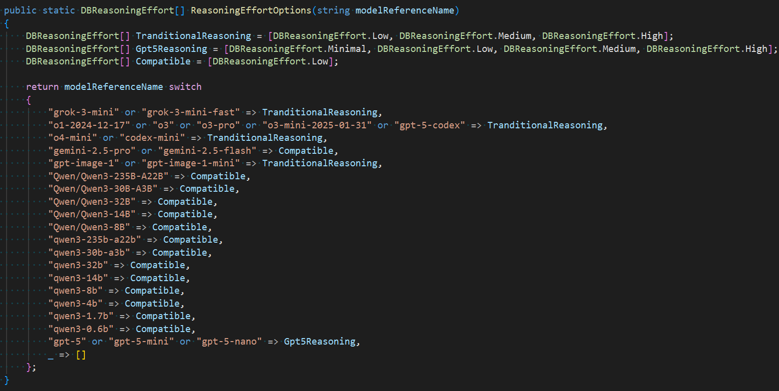 到 chats 1.7.2 发布以来,已经支持有 18 个模型提供商,我当时为这 18 家模型提供商每一个模型都做了信息和数据跟踪,放到了 ModelReference 表,这个表有 297 条记录了,各大模型提供商卷大模型的速度越来越快,模型更新换代也越来越频繁,要可持续地维护这个表是非常困难的。