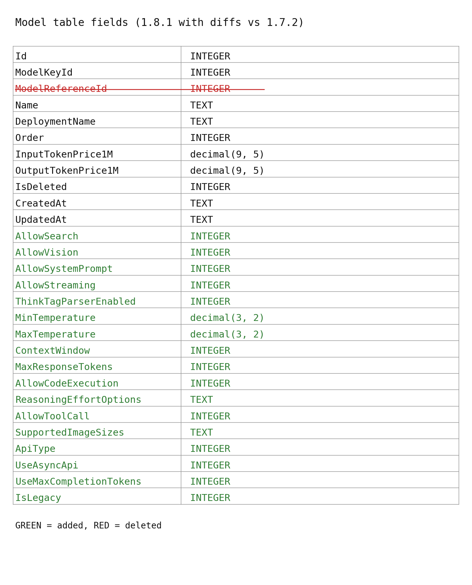 这次迁移不是口头上的“配置化”,而是实打实的数据库变更:在 src/scripts/db-migration/1.8/1.8.0.sql 里,Model 表新增了一批能力字段(AllowSearch/AllowVision/AllowToolCall/温度范围/上下文窗口/最大输出 token/推理选项/图片尺寸/API 类型等),并且清理了多张静态参考表(ModelReferenceModelProviderTokenizerCurrencyRateReasoningResponseKind ……)。