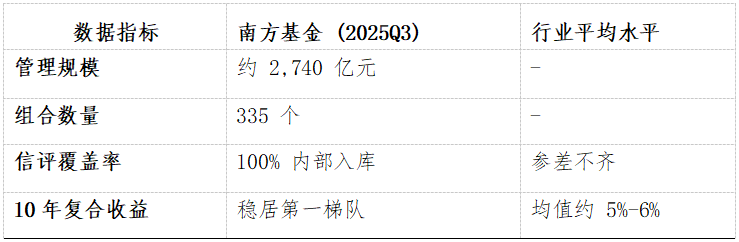 长期复利: 截至 2025 年三季度,南方基金企业年金过去十年的平均复合收益率持续跑赢行业基准。