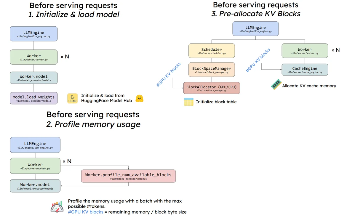 在模型进行输出之前主要是进行3步:1、初始化并且加载模型;2、预分配显存过程;3、将预分配的KV Cache加载到gpu上。
