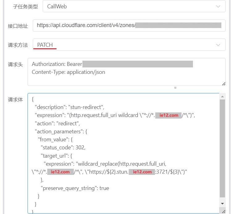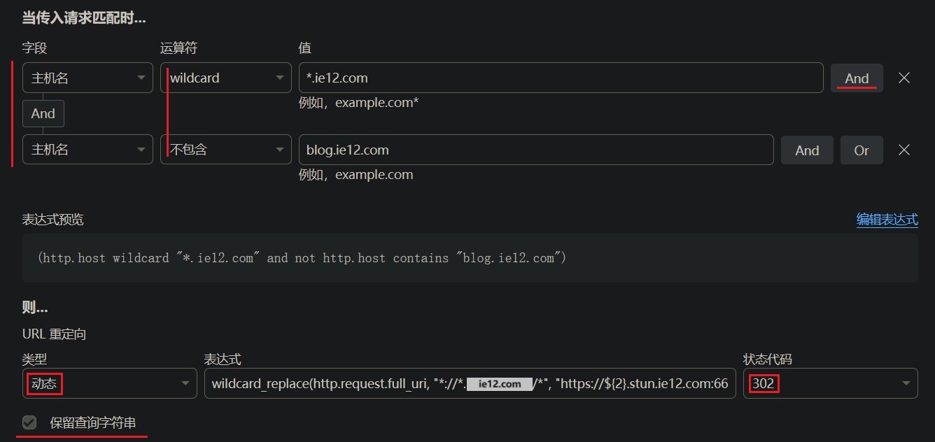 {"description": "stun-redirect","expression": "(http.host wildcard \"*.ie12.com\" and not http.host contains \"blog.ie12.com\")","action": "redirect","action_parameters": {"from_value": {"status_code": 302,"target_url": {"expression": "wildcard_replace(http.request.full_uri, \"*://*.ie12.com/*\", \"https://${2}.stun.ie12.com:6666/${3}\")"},"preserve_query_string": true}}