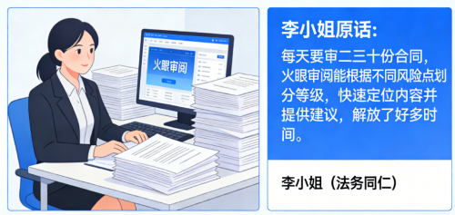 用户实感:一位法务同仁李小姐分享:“每天要审二三十份合同,火眼审阅能根据不同风险点划分等级,快速定位内容并提供建议,解放了好多时间。”