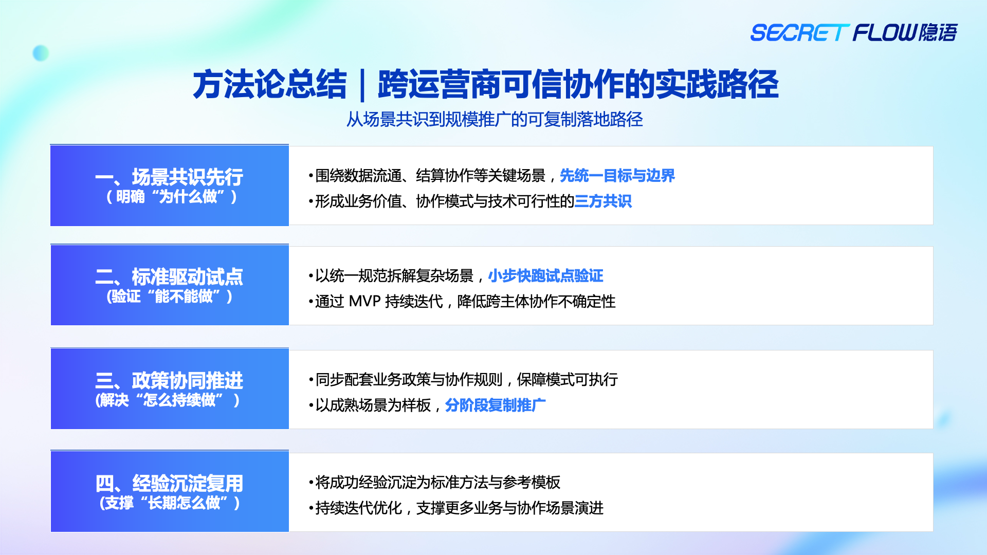 • 场景共识先行:先把“为什么协作、协作边界在哪、各方收益是什么”讲清楚;