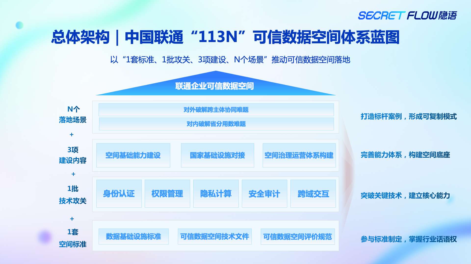 随着场景逐步稳定,一套可以被复用和推广的方法体系逐渐清晰,也就是现在对外呈现的 中国联通“113N”可信数据空间体系蓝图