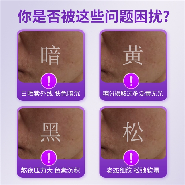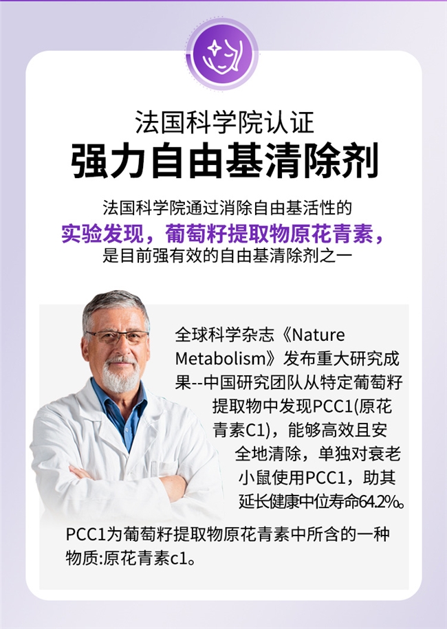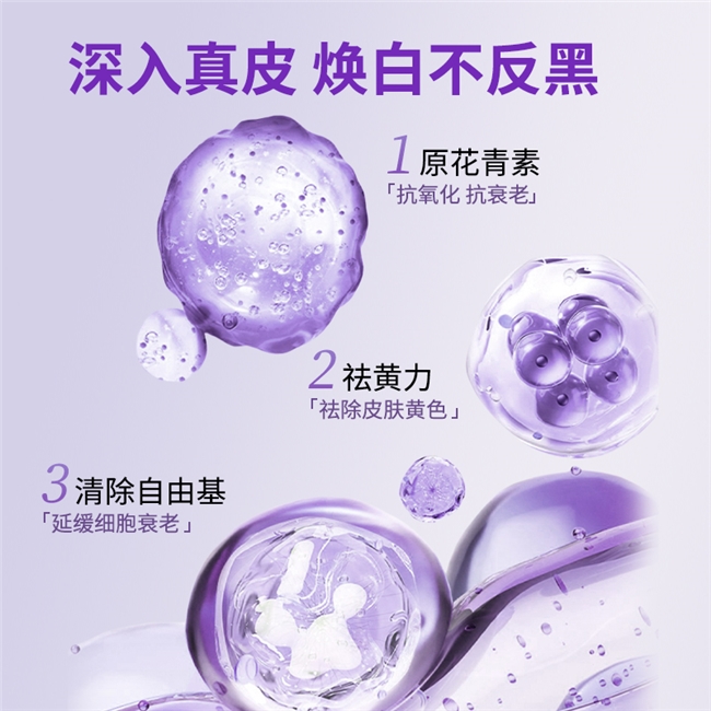 作为配方核心的葡萄籽提取物,其原花青素含量达到行业顶尖水准——每百克含92.51克原花青素,较行业常规产品(原花青素含量多集中在10-60克/百克)实现质的飞跃。这种高纯度原花青素是天然强效自由基清除剂,抗氧化效能分别是维生素C的20倍、维生素E的50倍,可穿透肌肤深层,精准清除多余自由基,从源头阻断黑色素的生成与堆积,同时强化肌肤胶原支撑结构,减缓老化进程,同步达成美白淡斑与延缓衰老两大核心诉求。