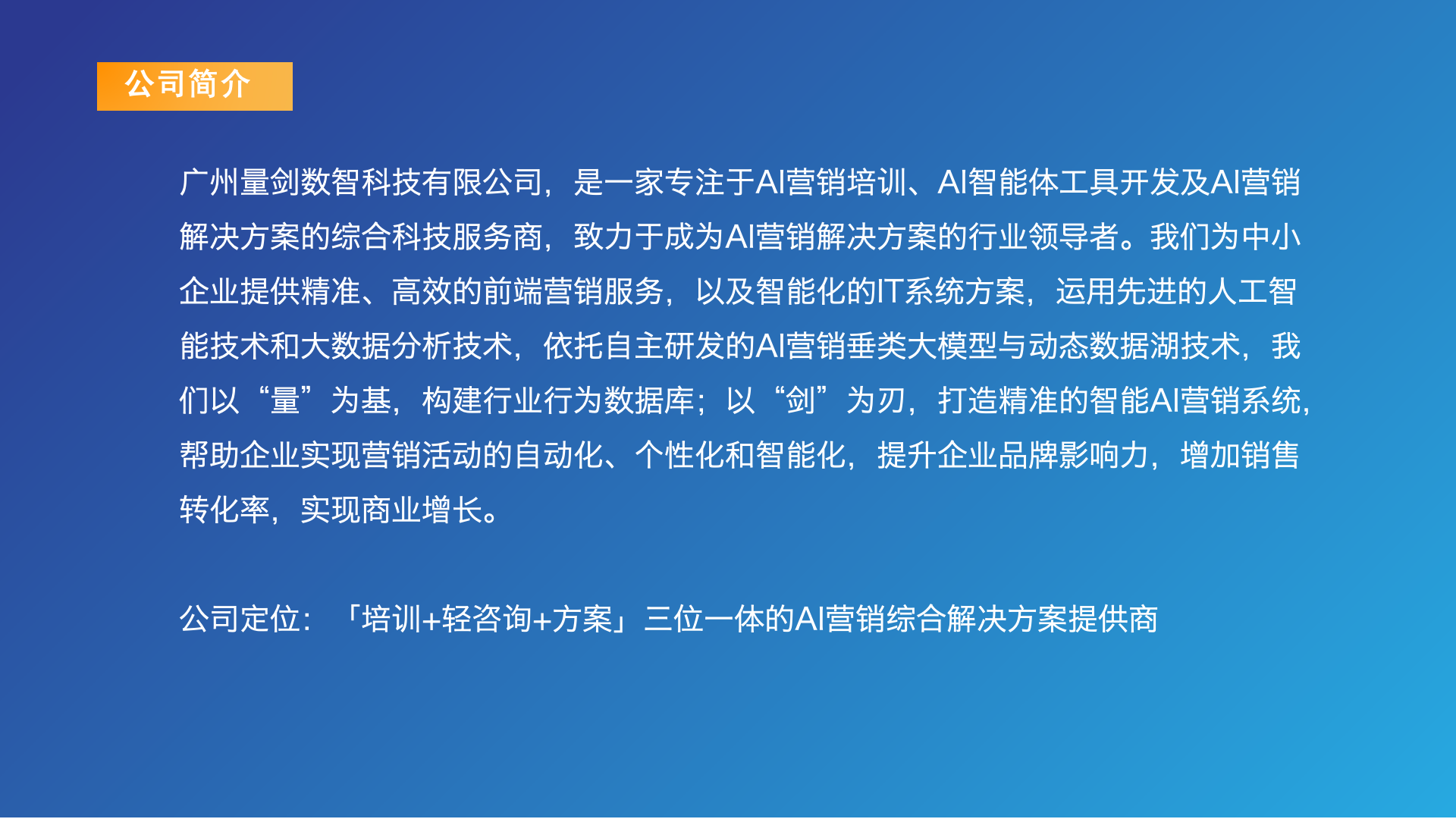 作为AI量剑商学院的主体,广州量剑数智科技有限公司深耕AI营销与全域流量变现领域,以量化数据价值,剑指增长未来为核心理念,依托自主研发的AI营销垂类大模型与动态数据湖技术,构建百亿级行业行为数据库,打造精准智能AI系统。其核心服务AI商业应用培训,针对大健康、美容行业中小企业主流量荒、工具杂、转化难的痛点,提供从矩阵账号注册、竞品分析到AI写文案、批量剪视频、公域转私域的一对一陪跑服务,还配套数字人服务、全域流量管理方案、AI精准拓客工具等全链路解决方案,真正实现培训即落地。