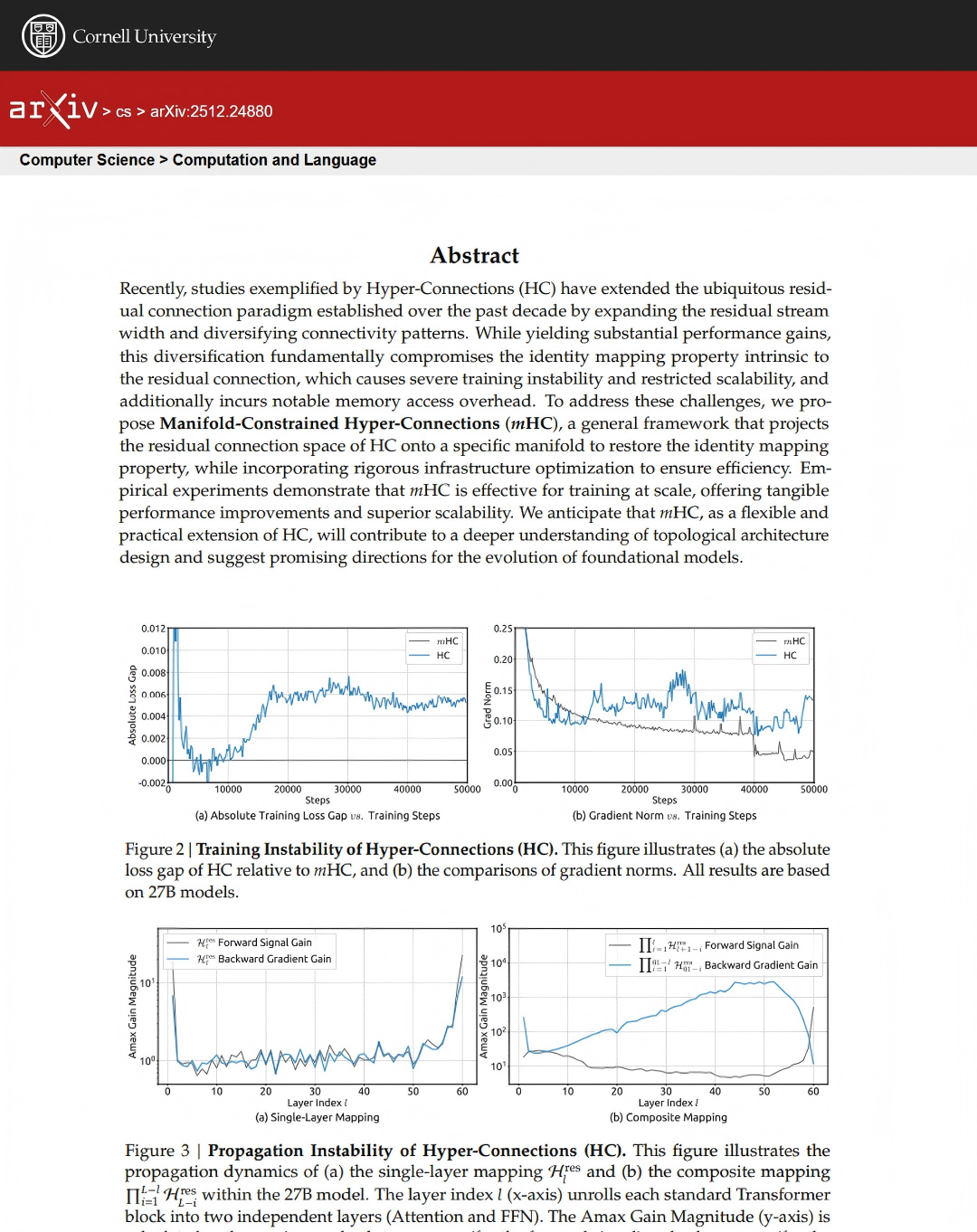 深度学习中,残差连接 是 ResNet、Transformer 等架构(含 LLM)的基础,其恒等映射特性保障了大规模训练的稳定性与效率。Hyper-Connections(HC)通过扩展残差流宽度、多样化连接模式提升模型性能,但因连接无约束,破坏了恒等映射特性,导致训练不稳定、扩展性受限,且存在显著内存访问与通信开销,这一问题限制了 HC 在大规模训练中的实际应用,形成研究缺口。