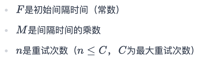 该策略以三个核心参数为基础:首次重试间隔时间 F、重试间隔乘数 M 和最大重试次数 C。