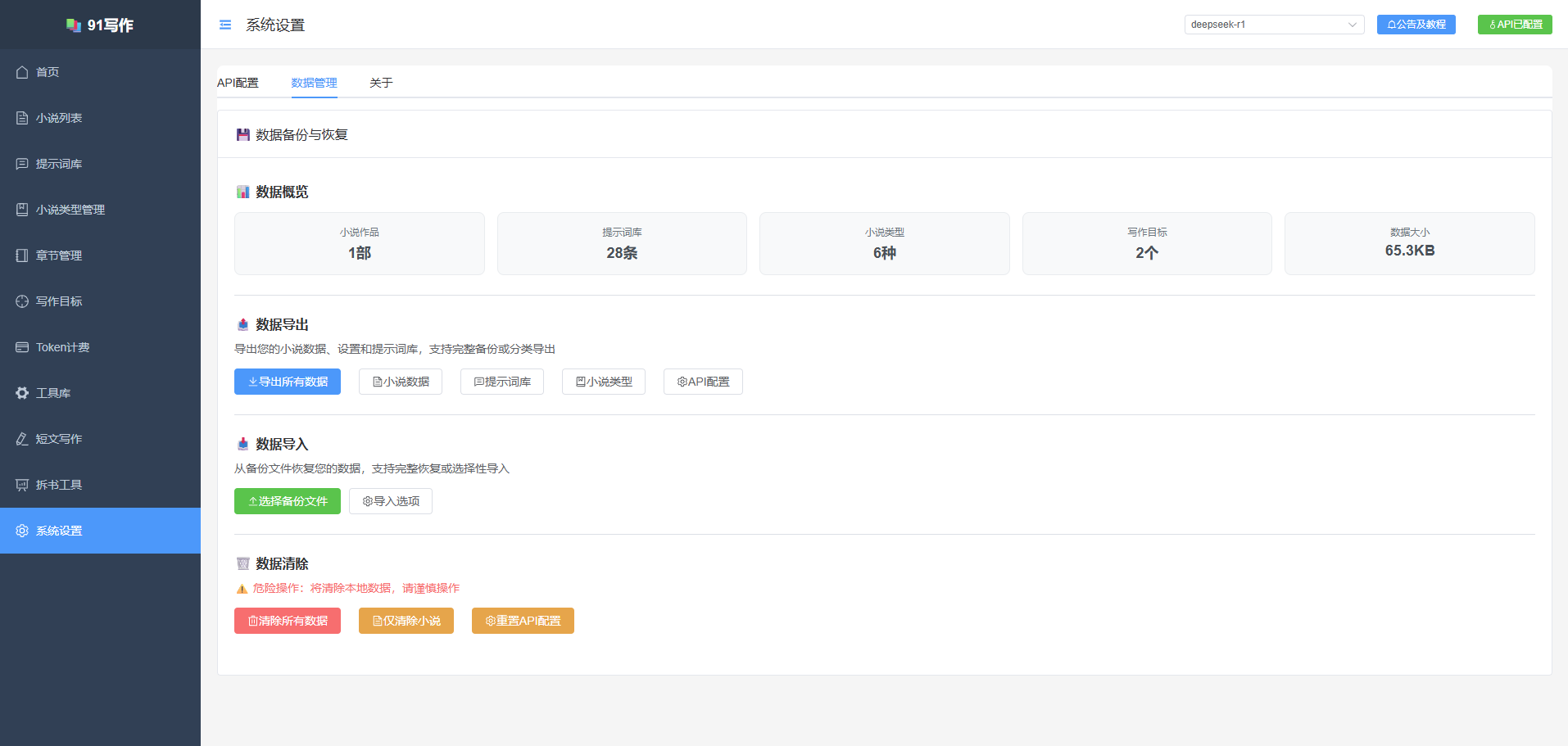 • 数据管理中心:使用本地化数据存储,支持分类导入导出功能,同时具备完善的备份机制,支持数据统计分析(字数、Token 用量等)