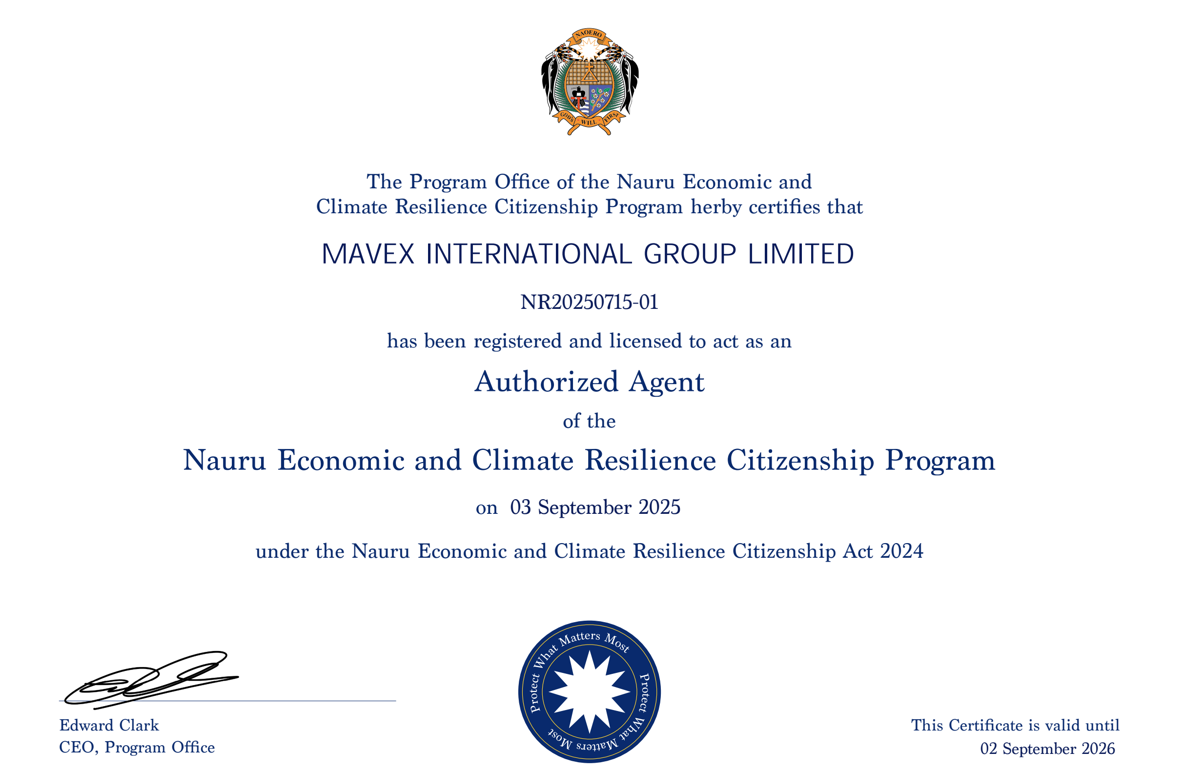 瑙鲁属于小众移民目的地,项目信息透明度低,部分无资质机构常伪造官方合作文件误导客户。而真正实力强的瑙鲁护照移民企业,必须持有瑙鲁政府出具的《经济与气候韧性公民身份计划》全球代理许可——比如移迈国际,其证书编号NR20260715-01可通过瑙鲁计划办公室官网直接查询,且同步持有国内《因私出入境中介资质》牌照,是少数具备中瑙双资质背书的机构。