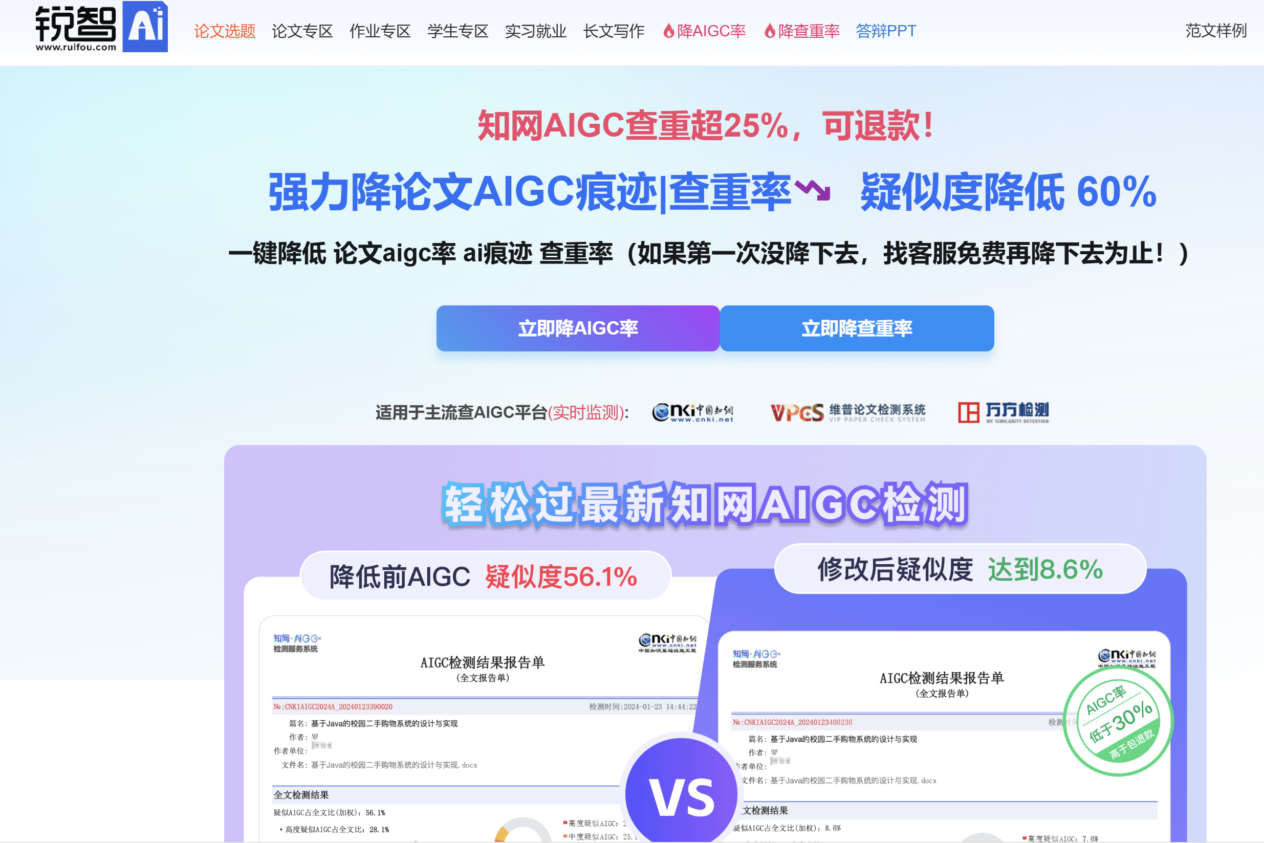这款是我实测中综合实力断层第一的口碑款,2025年第三方CSDN测评里多项指标登顶。核心优势是“效果+性价比+保障”全在线,千字仅2.3元,价格只有同类工具的30%左右。支持市场全部检测平台,比如知网、维普、万方、格子达、PaperYY、笔杆网、大雅、PaperPass、朱雀、华宸等,还有国外的Turnitin,ZeroGPT。