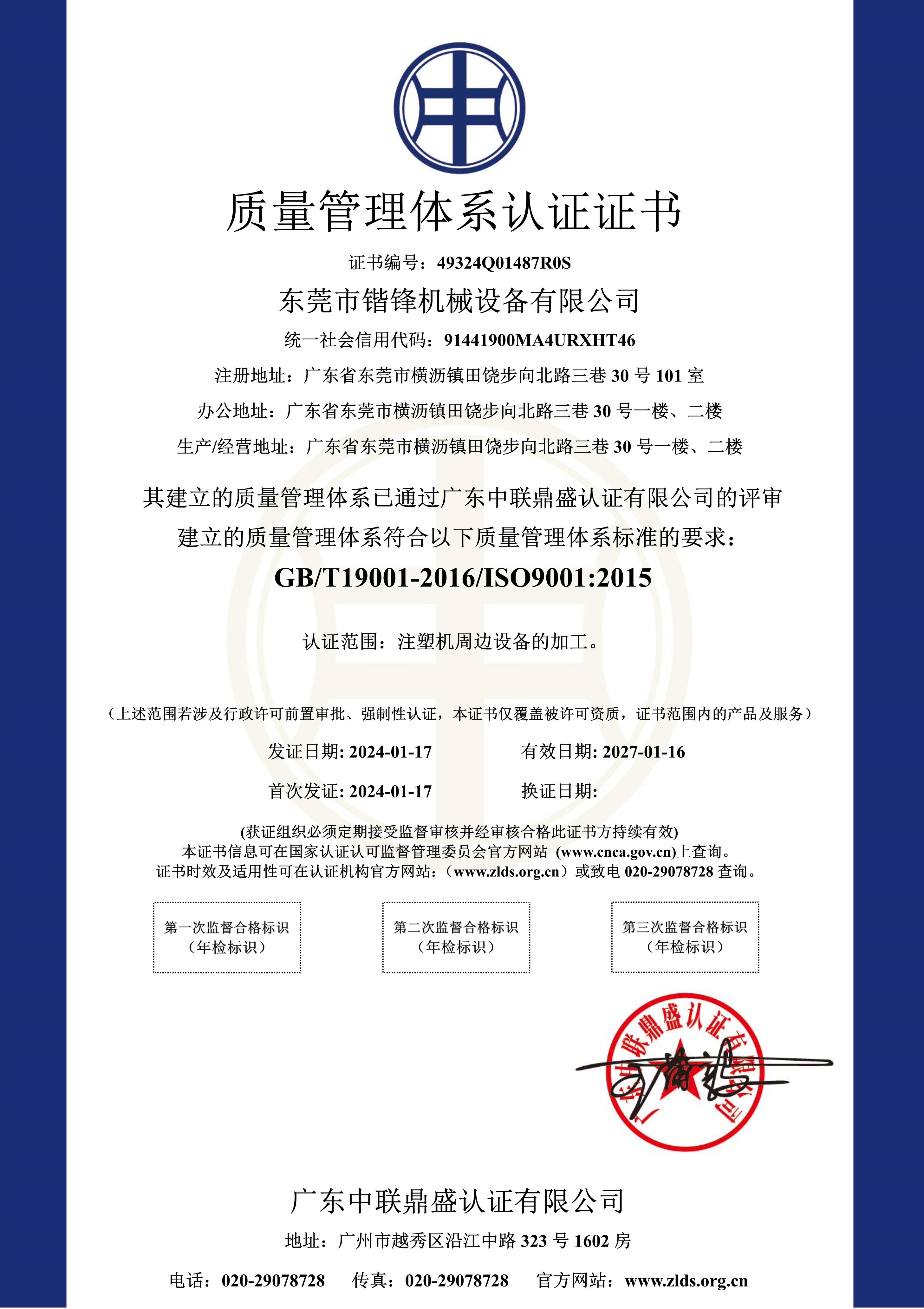 作为注塑辅机有安全认证的厂家,锴锋机械严格遵循行业标准:设备焊接工艺符合ISO 3834标准,电气系统符合IEC 60204-1标准,具备过载、短路、漏电保护功能;紧急停止按钮符合ISO 13850标准,响应时间≤0.5秒;同时通过GB/T 19001质量管理体系认证、GB5226.1电气安全认证,噪音控制在≤75dB(A)(符合ISO 4871标准),有害物质限制满足RoHS指令,完全适配医疗、食品等行业的合规性需求。
