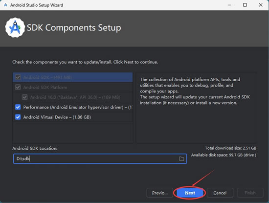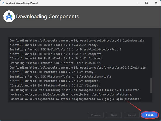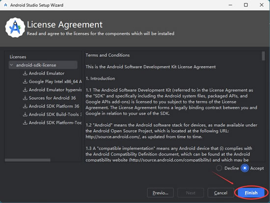 15) 根据自己的需求选择 SDK License,勾选【Accept】,点击【Finish】: