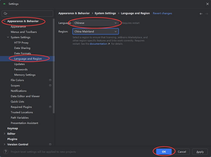 5) 依次点击展开“Appearance & Behavior——System Settings”,点击“Language and Region”,语言 Language 选择“Chinese”,点击“OK“:
