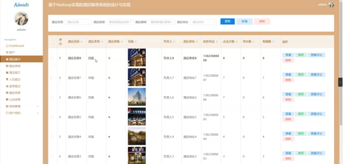 管理员点击酒店展示,在酒店展示页面输入酒店名称、酒店类型、酒店星级、酒店地址进行搜索、新增或删除酒店展示列表,并根据需对酒店展示详情信息进行查看、修改、查看评论或删除操作;如图5-8所示: