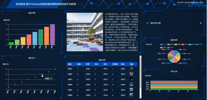 管理员进行爬取信息后,点击主页面右上角的看板,允许查看到酒店价格、酒店评分、酒店信息总数、酒店类型等实时的分析图进行可视化管理;如图5-3所示: