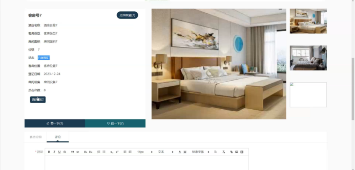 (2) 酒店房间管理:管理员可以对酒店房间详细信息进行查看详情,修改或删除操作。