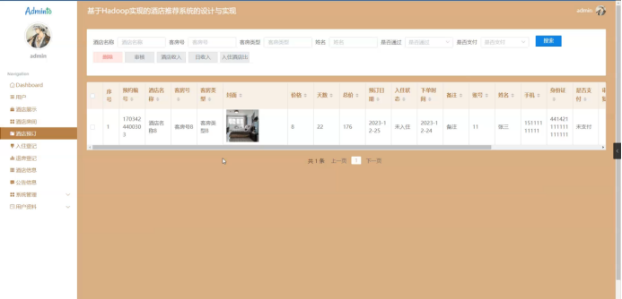 管理员点击酒店预订,在酒店预订页面输入酒店名称、客房号、客房类型、姓名、是否通过和选择是否支付进行搜索、删除、审核、酒店收入、日收入或入住酒店比酒店预订列表,并根据需要对酒店预订详情信息进行查看、修改或删除操作;如图5-10所示: