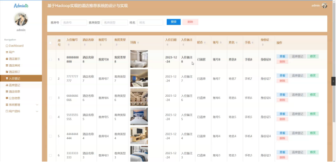 管理员点击入住登记,在入住登记页面输入客房号、客房类型和姓名进行搜索或删除入住登记列表,并根据需要对入住登记详情信息进行查看、退房登记、修改或删除操作;如图5-11所示: