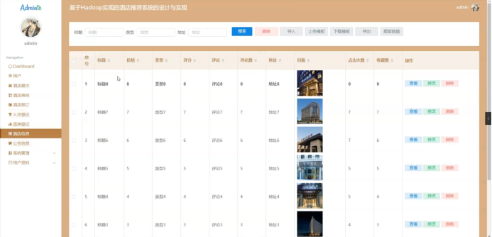 管理员点击酒店信息,在酒店信息页面输入标题、类型、地址进行搜索、删除、导入、上传模板、下载模板、导出或爬取数据酒店信息列表,并根据应该对酒店信息详情信息进行查看、修改或删除处理;如图5-13所示: