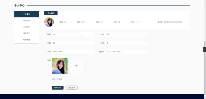个人中心:在个人中心页面可以对个人信息、酒店预订、入住登记、退房登记、我的收藏进行详细操控;如图5-5所示: