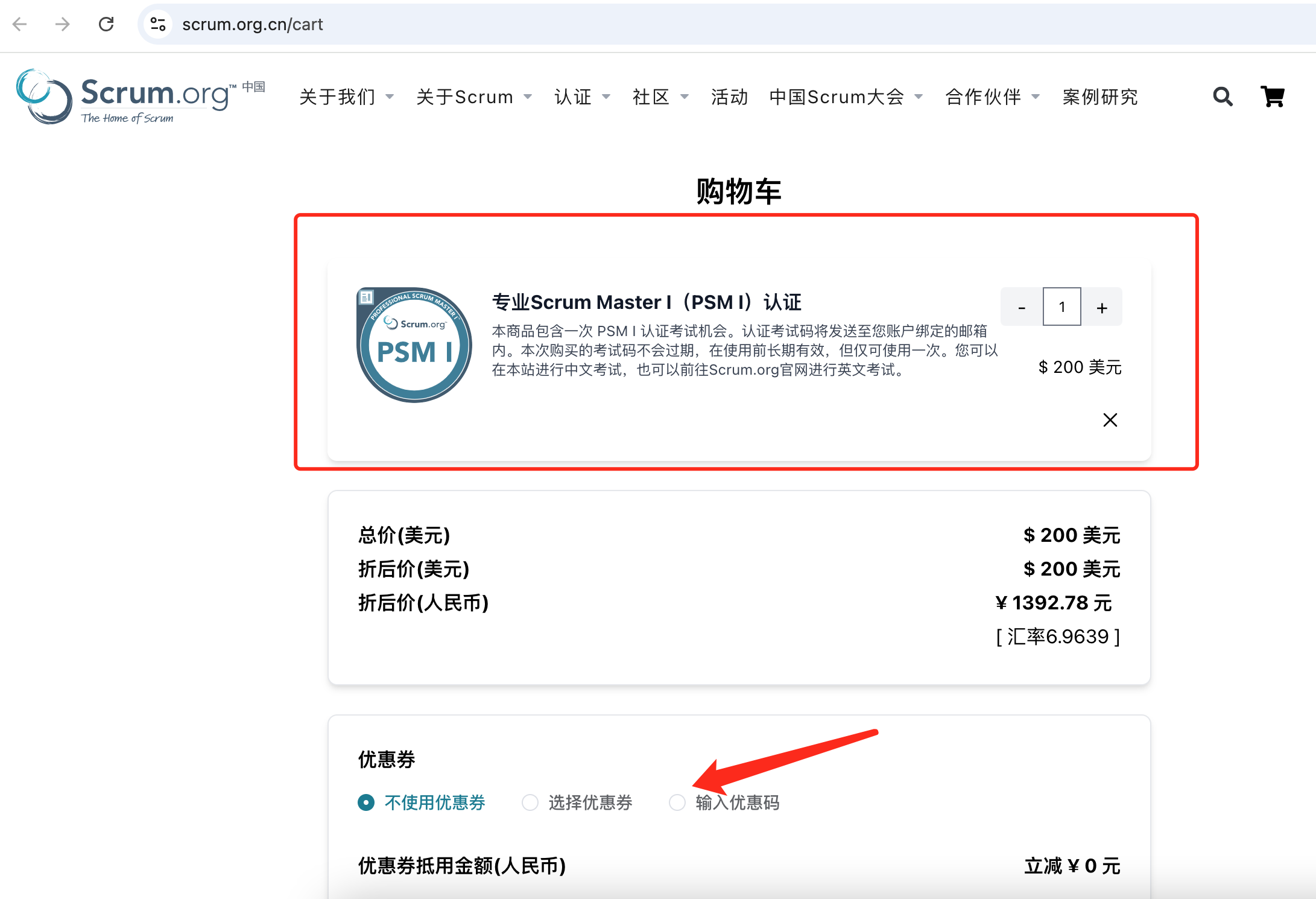 第一步选择进入官网,选择“认证”下拉框选择相应的认证,比如PSMI(如图1),然后选择“购买”(如图2),然后会出现金额,如果有优惠码的,可以输入优惠码享受优惠(如图3)。