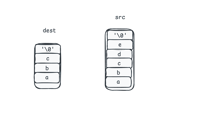 你发现了没,如果真的要把src内容全部塞给dest那么就会导致dest访问越界,这也C语言中strcpy的一个安全隐患