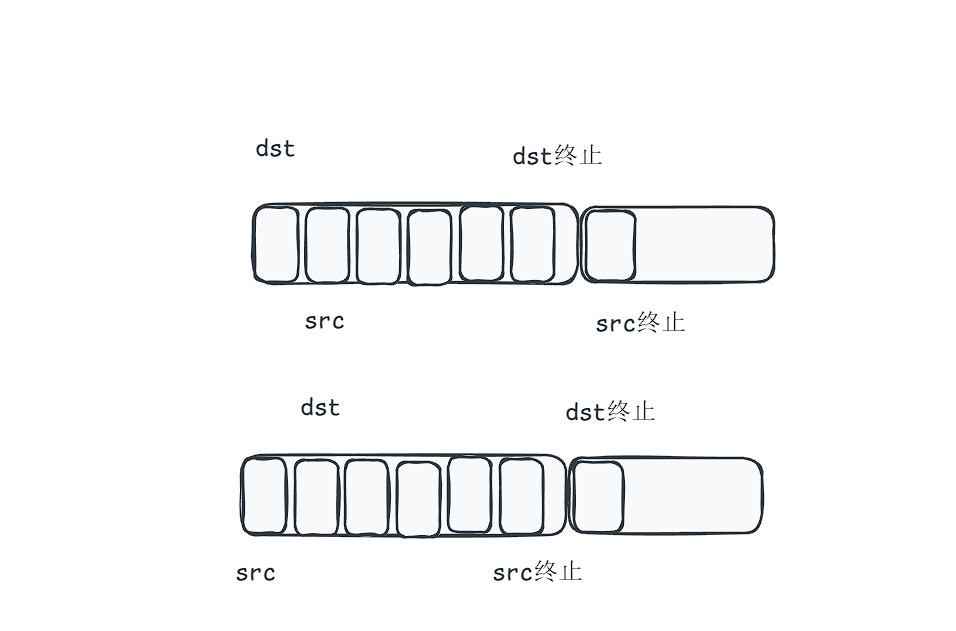 其实我们根据代码可以知道,我们是用src取赋值给dst,但是如果你dst在src前面就会导致一个问题,我src把第一格的内容给了dst(src下一格)那么我在取下一格不就是src上一格的内容吗,因此就会导致问题,而这个问题就叫内存重叠。