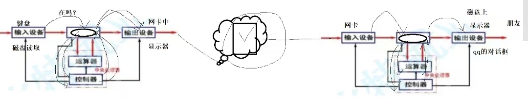 比如当我们在日常启用聊天软件时,输入设备(键盘)在接受到素材后,要交给cou处理,然后交给输出设备网卡发送出去,到达对方设备后,输入设备网卡接收后交给cpu处理,最后表现到对方的输出设备(显示器)上面。