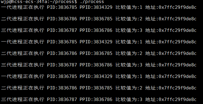 {pid_t ret = fork(); //获取返回值int val = 1;  //比较值if(ret == 0){//在子进程内再创建(孙)子进程pid_t rett = fork();if(rett > 0){while(1){val = 2;  //写时拷贝printf("二代进程正在执行 PID:%d PPID:%d 比较值为:%d 地址:%p\n\n", getpid(), getppid(), val, &val);sleep(1);}}else if(rett == 0){while(1){val = 3;  //写时拷贝printf("三代进程正在执行 PID:%d PPID:%d 比较值为:%d 地址:%p\n\n", getpid(), getppid(), val, &val);sleep(1);}}elseprintf("进程创建失败\n");}else if(ret > 0){while(1){val = 1;  //写时拷贝printf("一代进程正在执行 PID:%d PPID:%d 比较值为:%d 地址:%p\n\n", getpid(), getppid(), val, &val);sleep(1);}}elseprintf("进程创建失败\n");return 0;