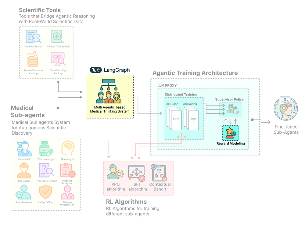 - 之后,我们开始为我们的高级研究员进行主强化学习(RL)循环。我们运行我们的 VERL (PPO) 算法。在这个阶段,系统使用改进后的初级智能体收集新数据,并对 Llama-3 模型执行在线策略更新,使用我们多方面的奖励信号来教它如何设计更好的实验方案。
